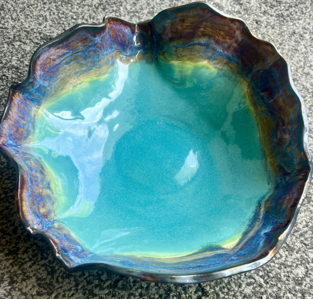 Functional stoneware, textured and colorful, with a variety of organic shapes and imprints, all inspired by Nature. Glazing combinations on smooth pieces are purposefully layered to create movement, color, and beauty.