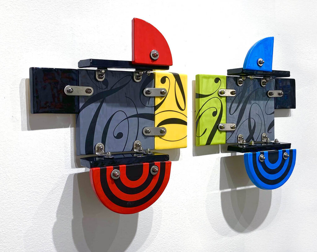 Handmade ceramic tiles with decals and stainless steel brackets.
