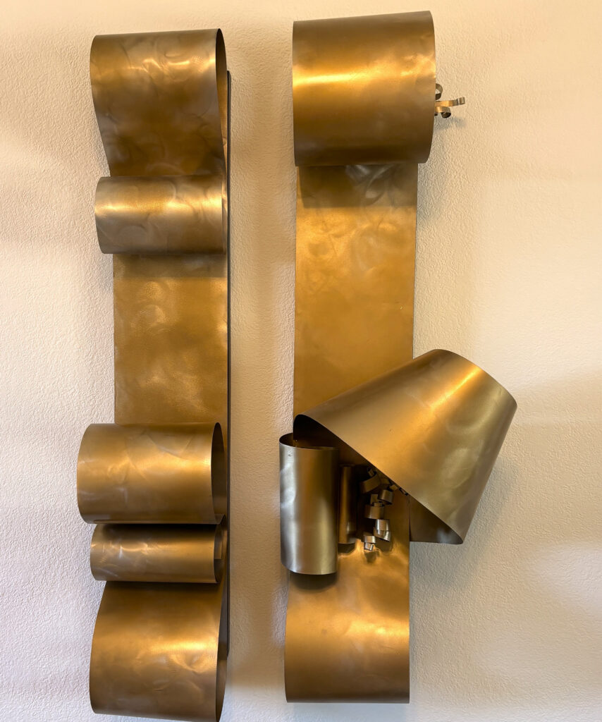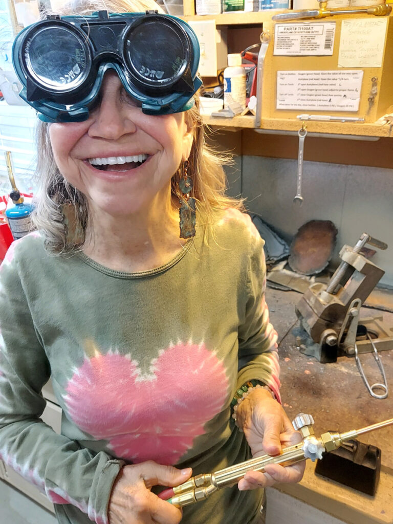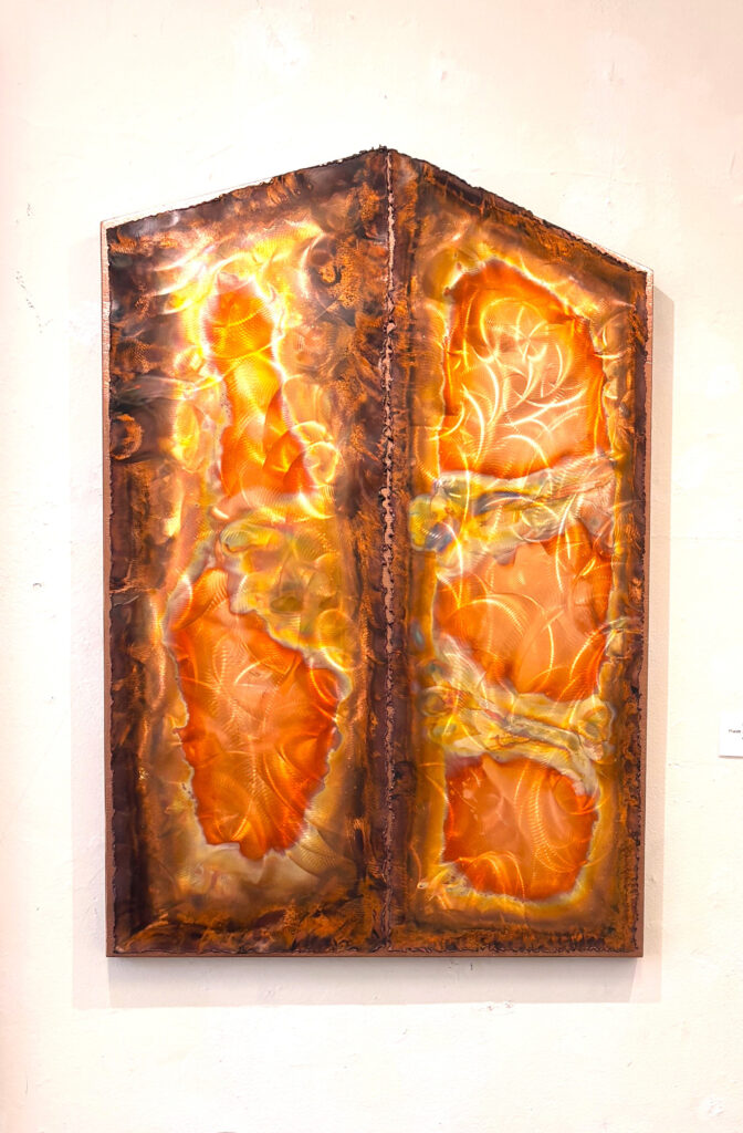 Copper, steel, brass that I cut, torch, patina, and rust. Small jewelry pieces and all sizes of wall art.