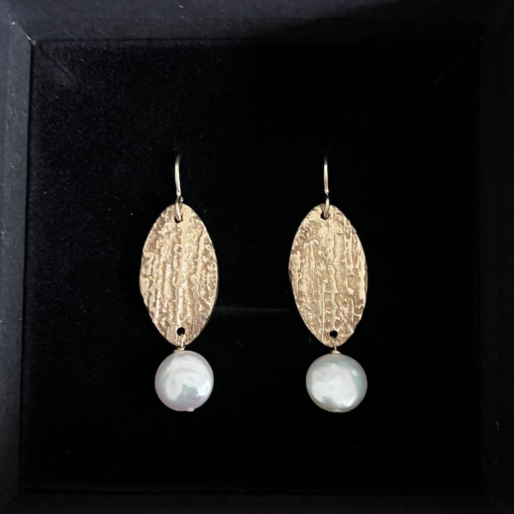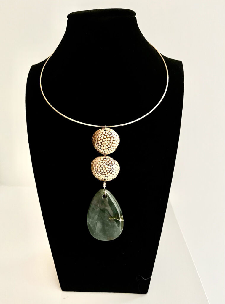 I work in precious metal clay, which is a very unique process. I am inspired by organic shapes and midcentury design. I work in bronze, silver, and steel to create earrings, necklaces, and bracelets.