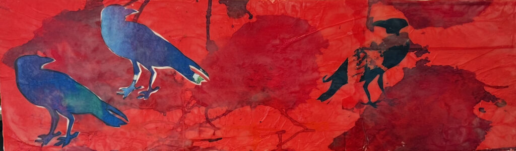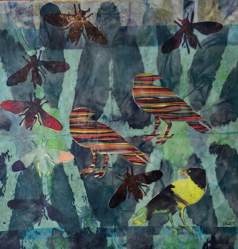 Layers of hand-painted and collected tissue paper, combined with oil paint in beeswax and damar varnish, create ephemeral images between the human experience and the essence of the wild. They are reflections on coexistence and love.