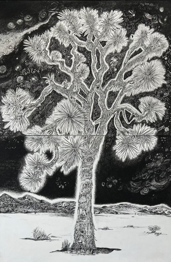 I create detailed pen-and-ink drawings of nature, where the textures of trees are formed from layers of hidden words, phrases, and figures. These embedded elements carry messages of encouragement and inspiration, giving each piece depth beyond its surface.