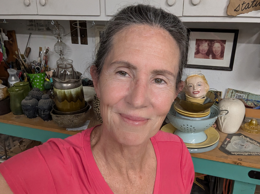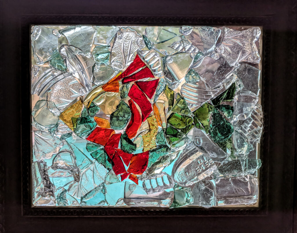 Whimsical garden sculptures created from all manner of found and repurposed items add color, fun, story, and dimension to the landscape. Additionally, I create a kind of luminescent faux stained glass art using debris mined from dumpsites in the desert.