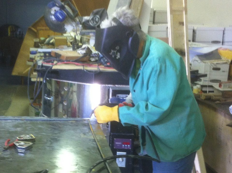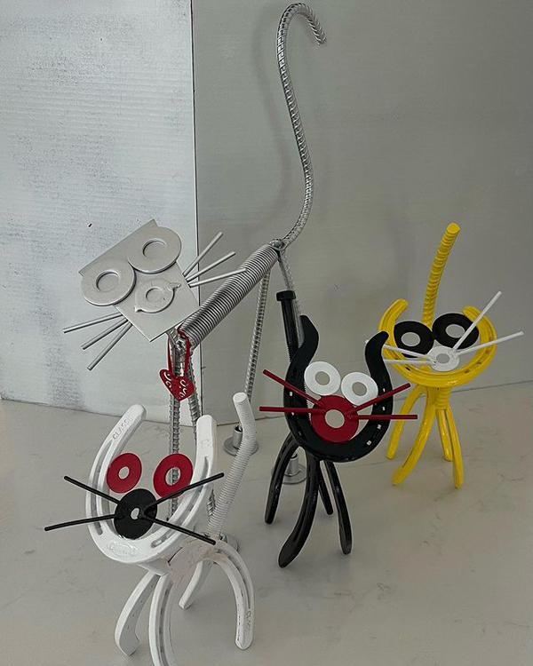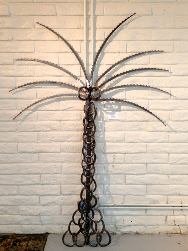 My work is made of recycled metal. Horseshoes turn into orbs/half planters, chicken wire makes interesting bodice pieces, and skid plates make awesome hearts! The studio is under reconstruction and will reopen in the new Indio Art Center next year.