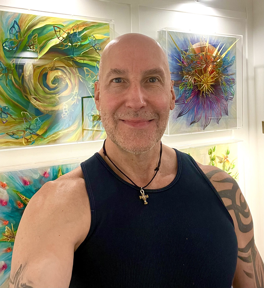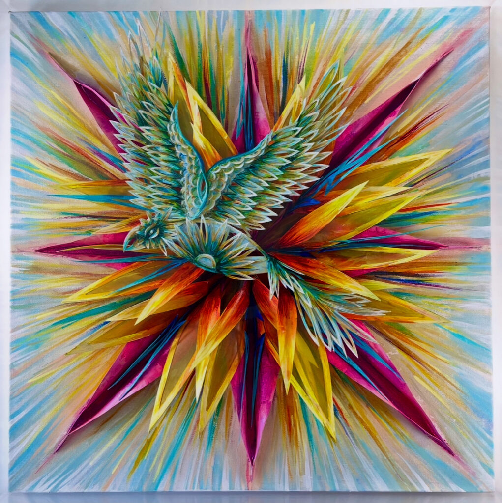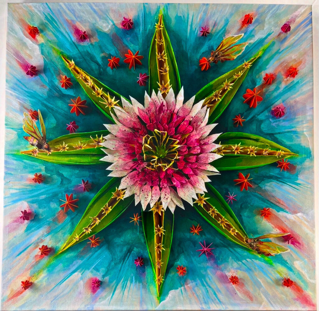 Scott’s works are essentially dioramas that are often inspired by mandalas. They are embedded with personal spiritual meaning. Every individual sculptural component is hand drawn and cut out of watercolor paper. His creations are painted with acrylics and india inks after assembling.