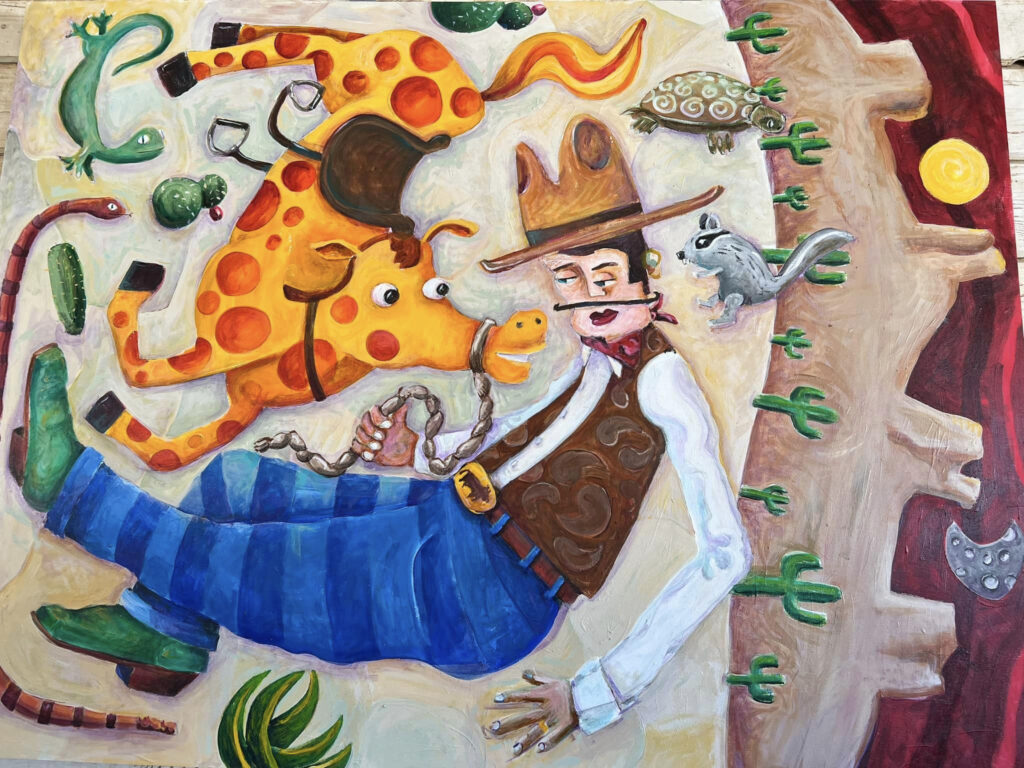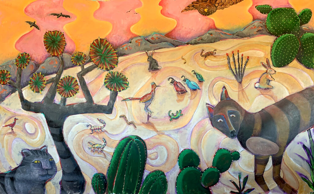 Fanciful desert images of happy people and animals floating over the Mojave.