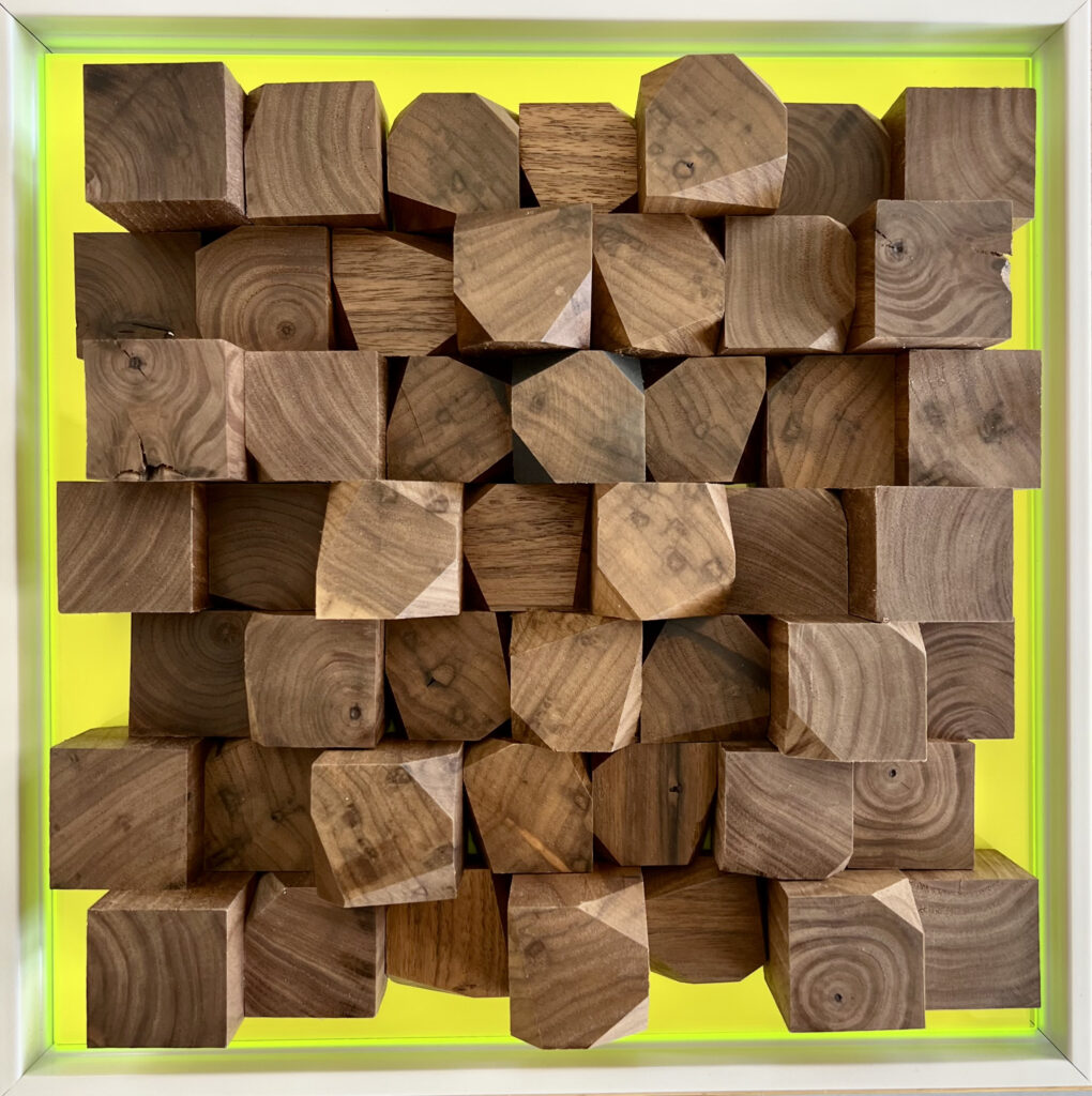 I create assemblage works emphasizing bold dimensional forms, geometric patterns, and luminous depths of color. Materials include plexiglass, wood, metal, and concrete. My background is in art, architecture, and construction.